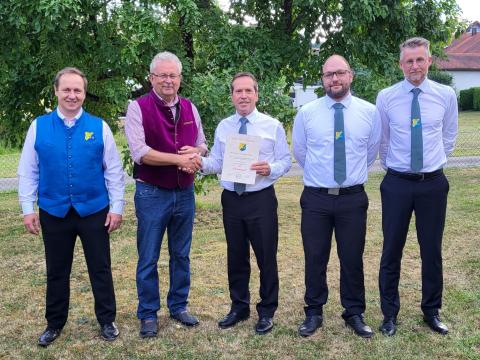 Bild: Stellvertretender Vorsitzender Andreas Sachs (rechts) überreichte mit Ehrenamtsbeauftragten Daniel Schmidbauer (2. von rechts), Festleiter Florian Fuchs (links) und Landrat Josef Laumer (2. von links) die Urkunde mit der Ernennung zum Ehrenmitglied an Erwin Poiger.